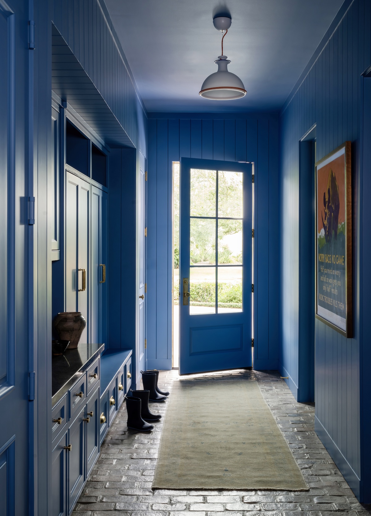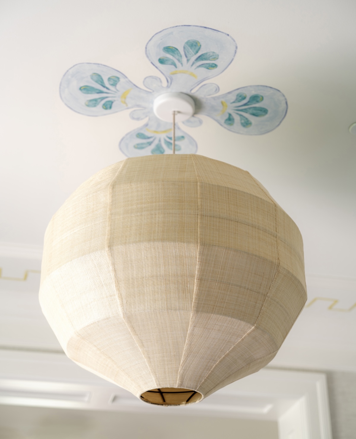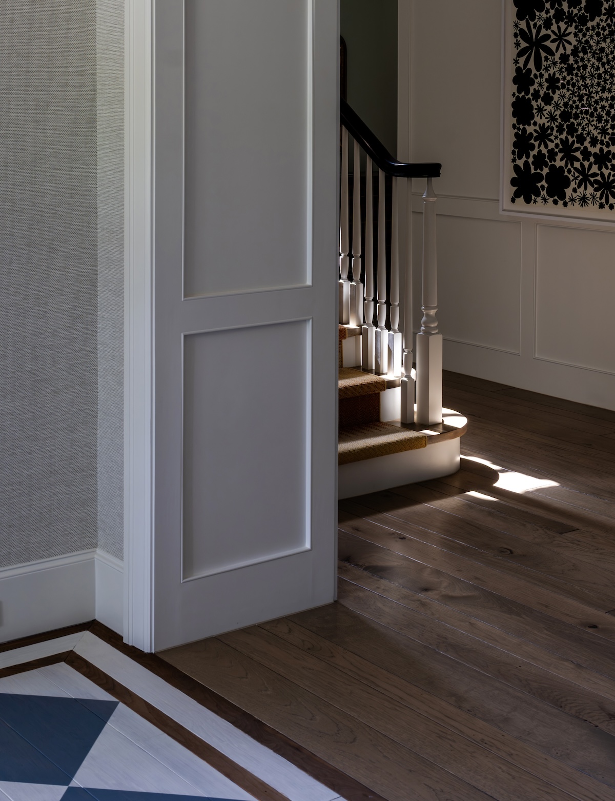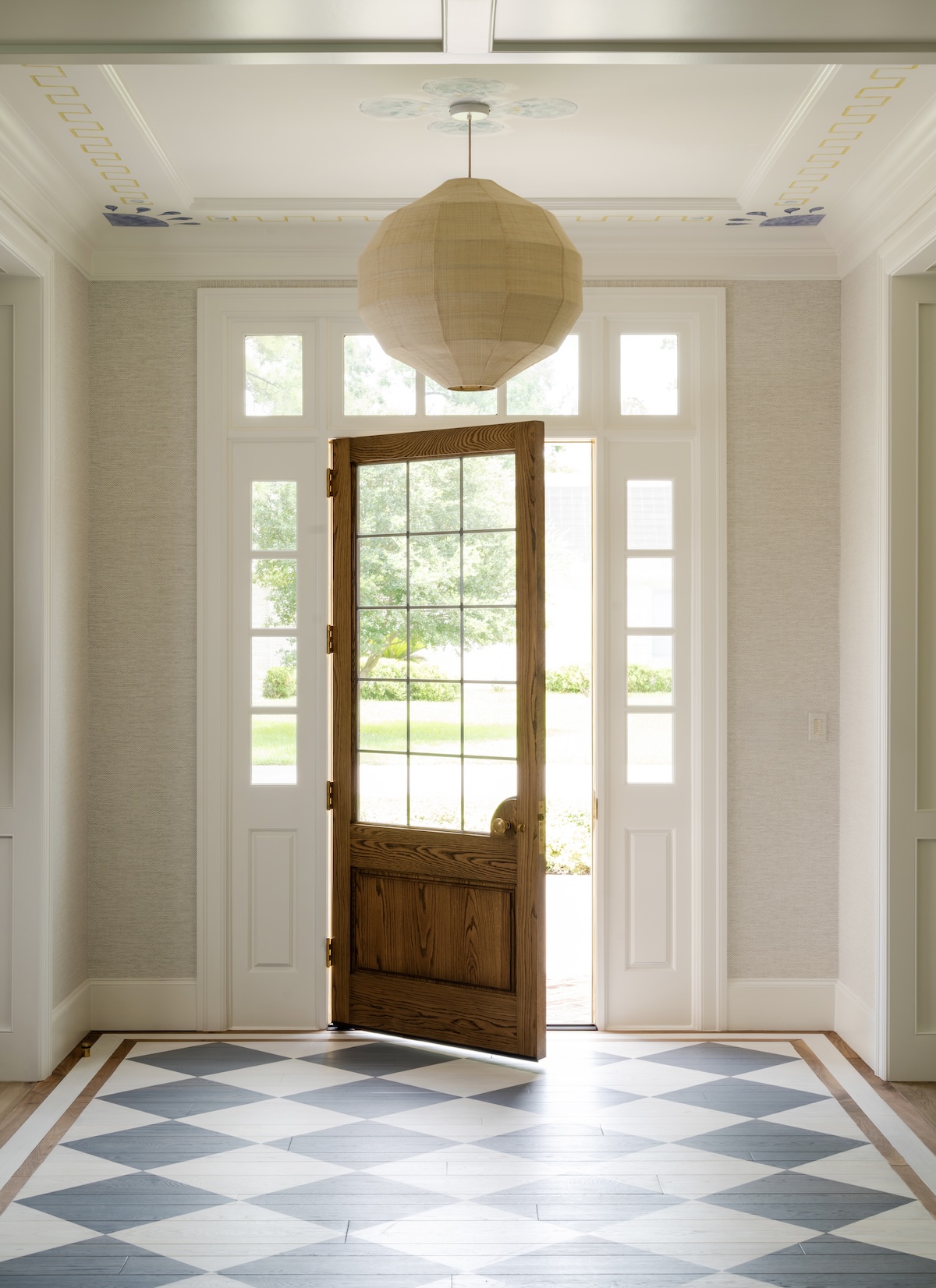 In the entry, we softened the formal architecture with a blue-and-white checker-painted floor—a nod to their love of New Orleans—and commissioned Verdigris Finishes to hand-paint a playful detail on the ceiling.