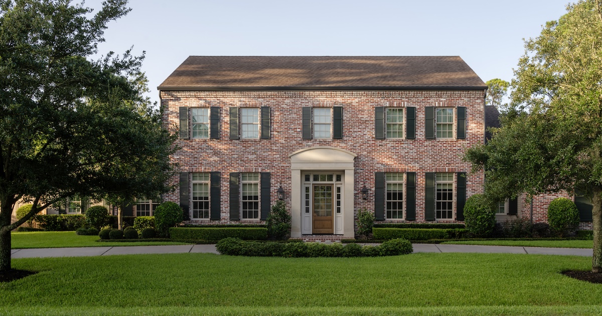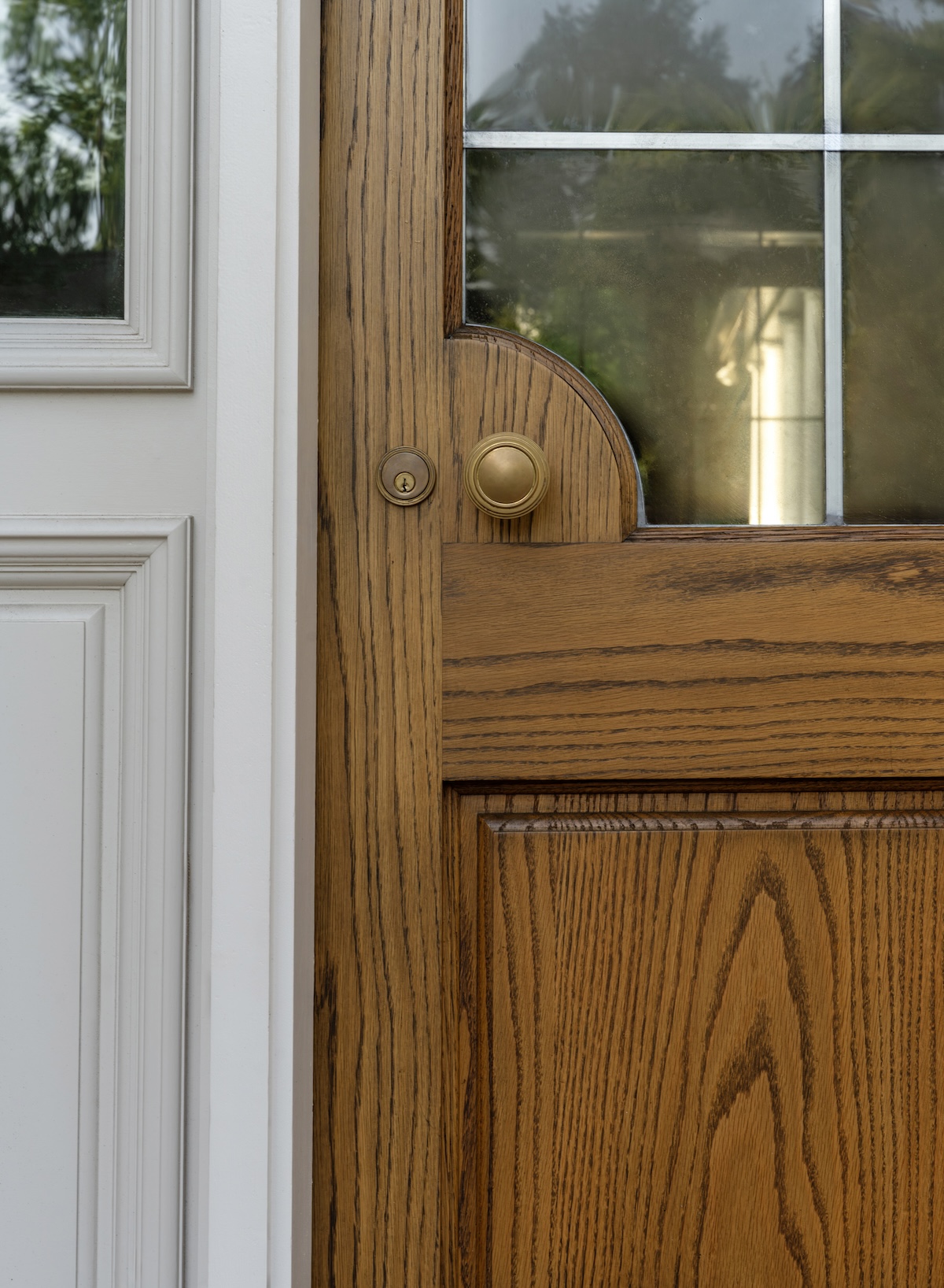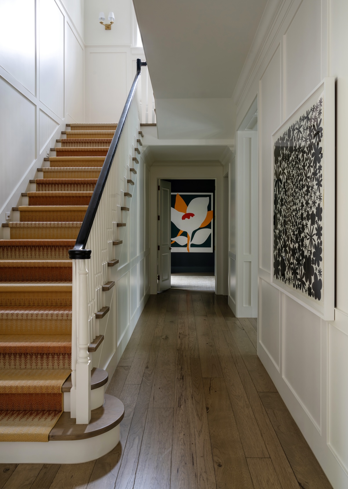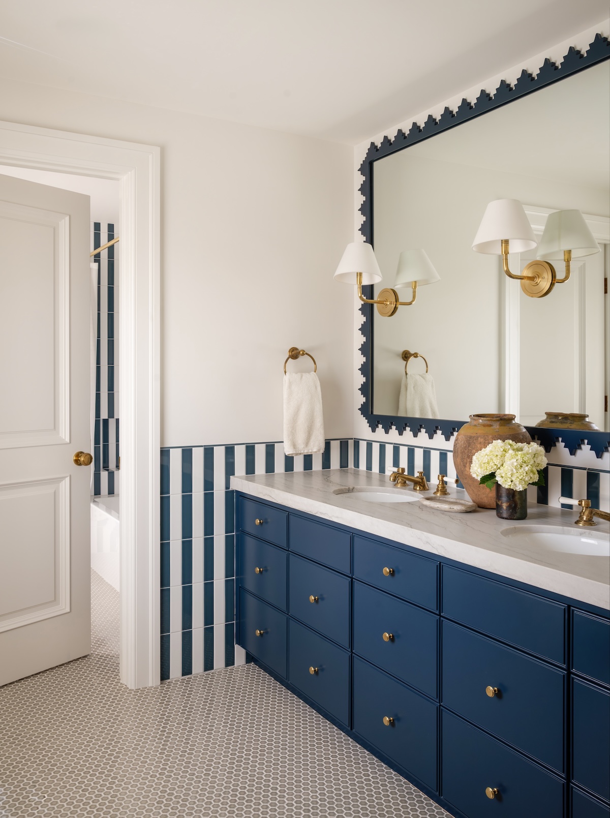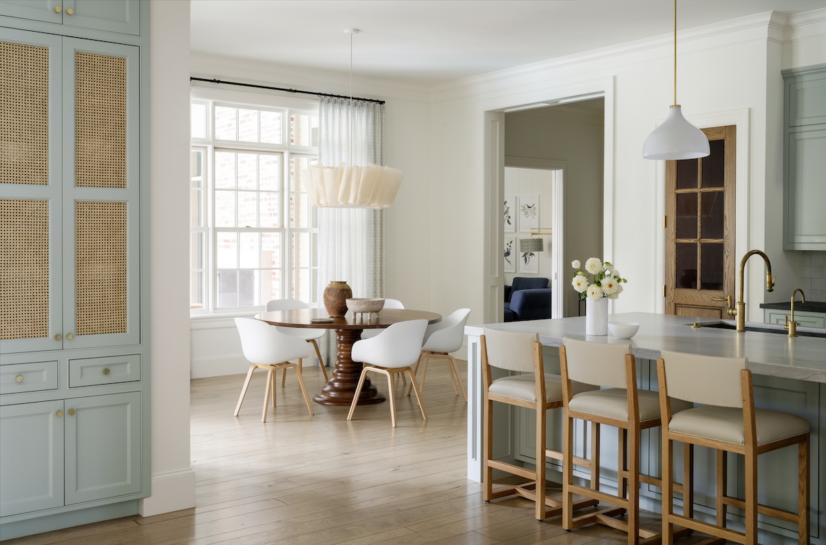In the entry, we softened the formal architecture with a blue-and-white checker-painted floor—a nod to their love of New Orleans—and commissioned Verdigris Finishes to hand-paint a playful detail on the ceiling.