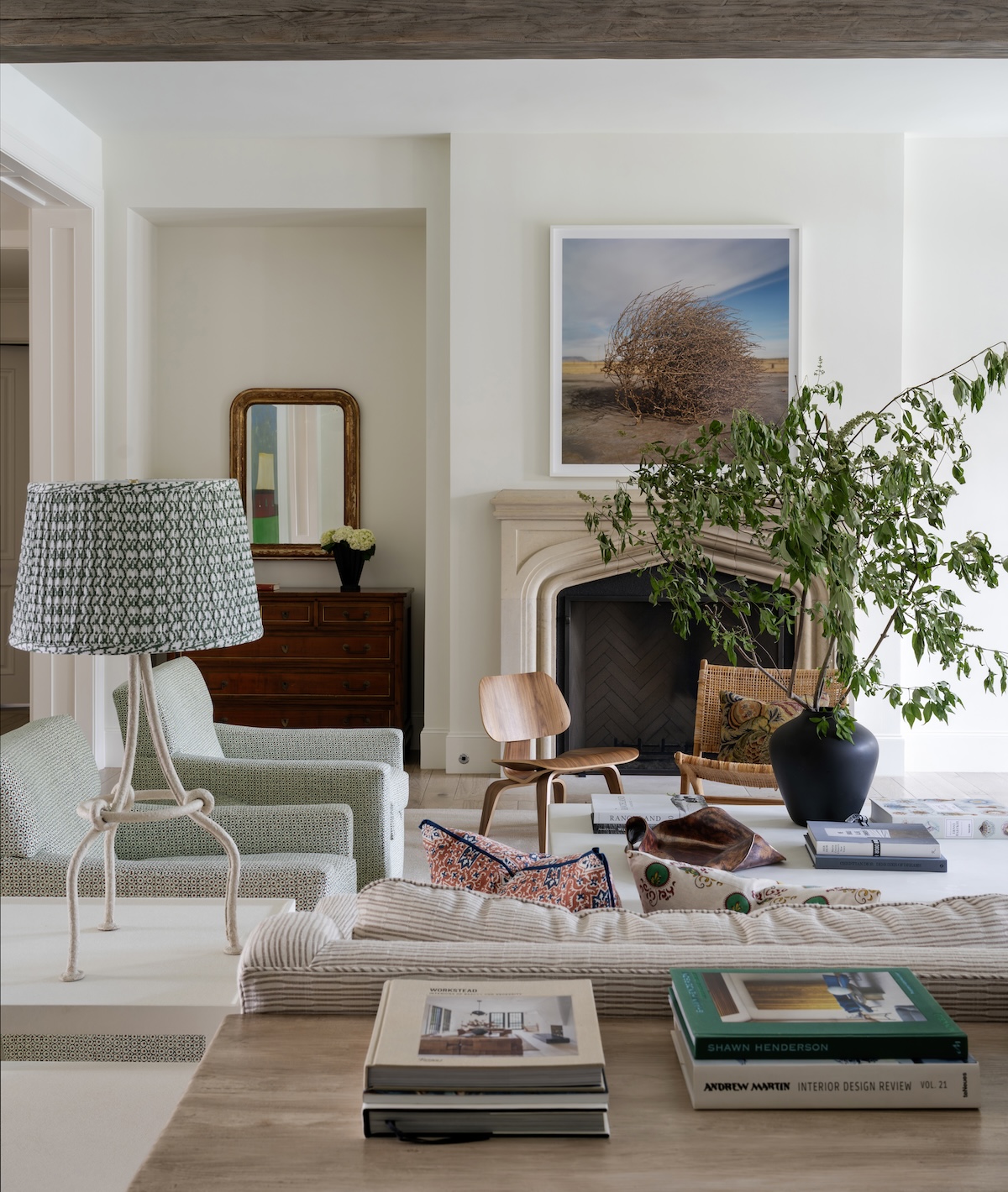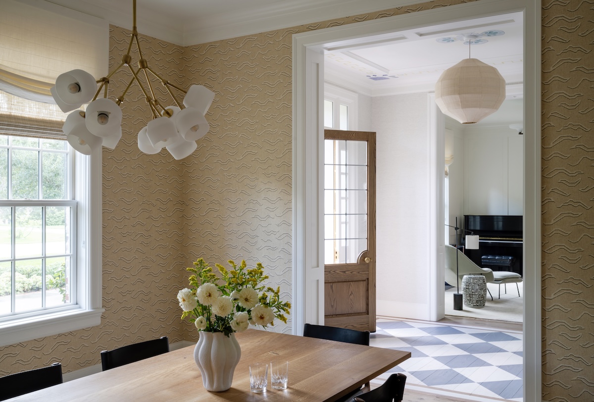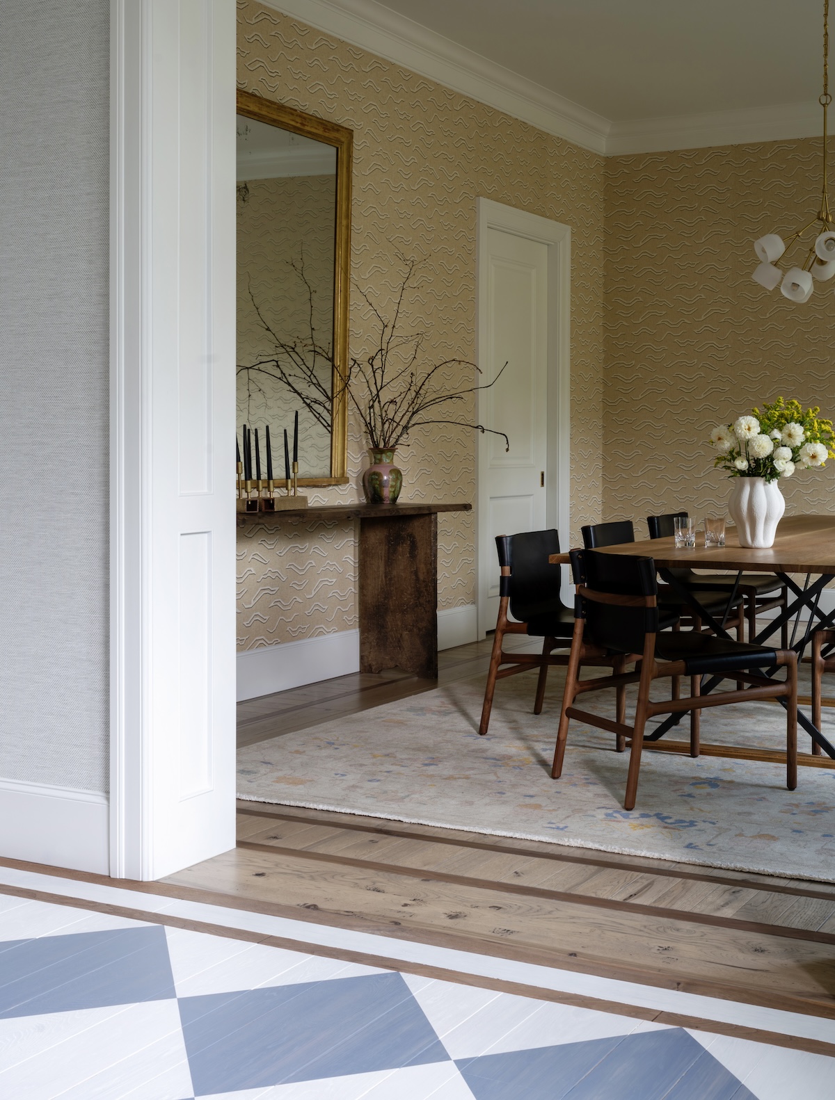 This home is all about balance—elegance and ease, tradition and personality. The clients wanted a space that felt elevated but approachable, kid-friendly, and ready to entertain. In the dining room, we began with a grounding wallcovering: a neutral, abstract Tibetan tiger pattern that supports future art collecting. An oak and steel table anchors the room, while walnut and black leather chairs by De La Espada bring comfort and craftsmanship. The oversized mirror and rustic console add just the right tension.
