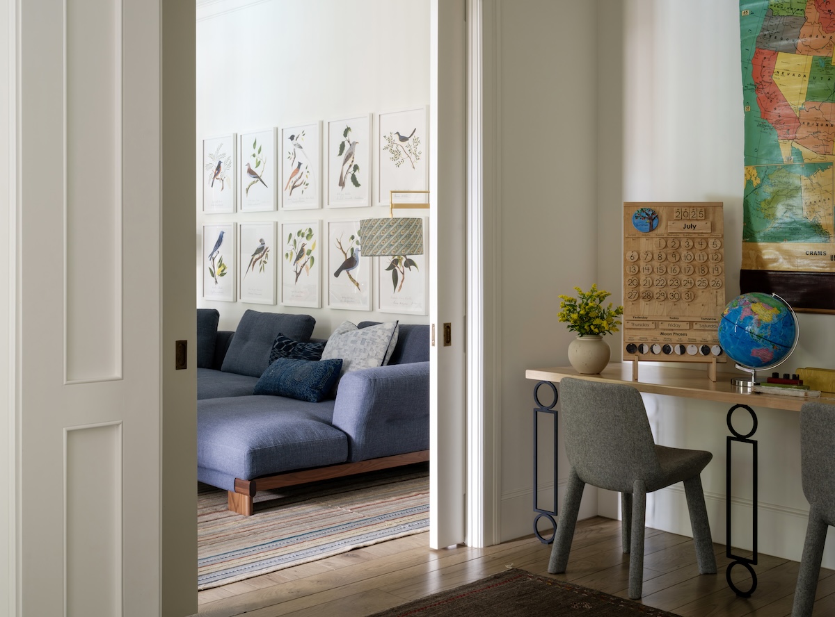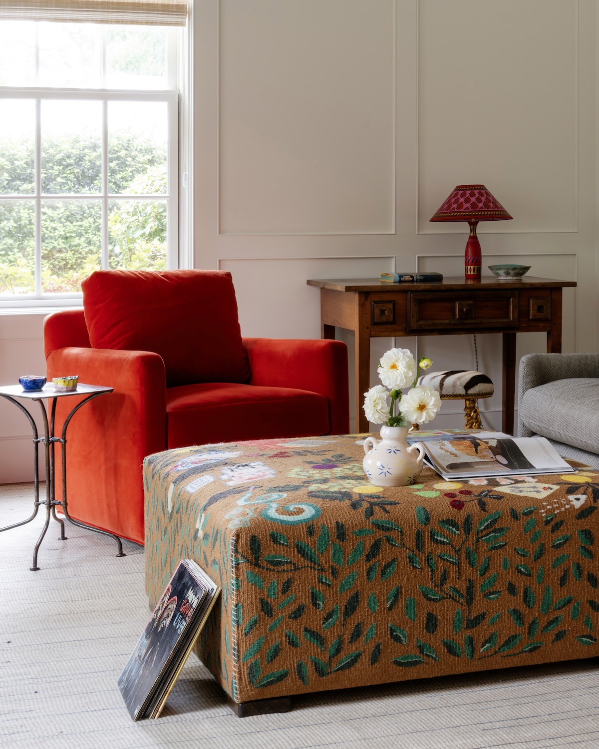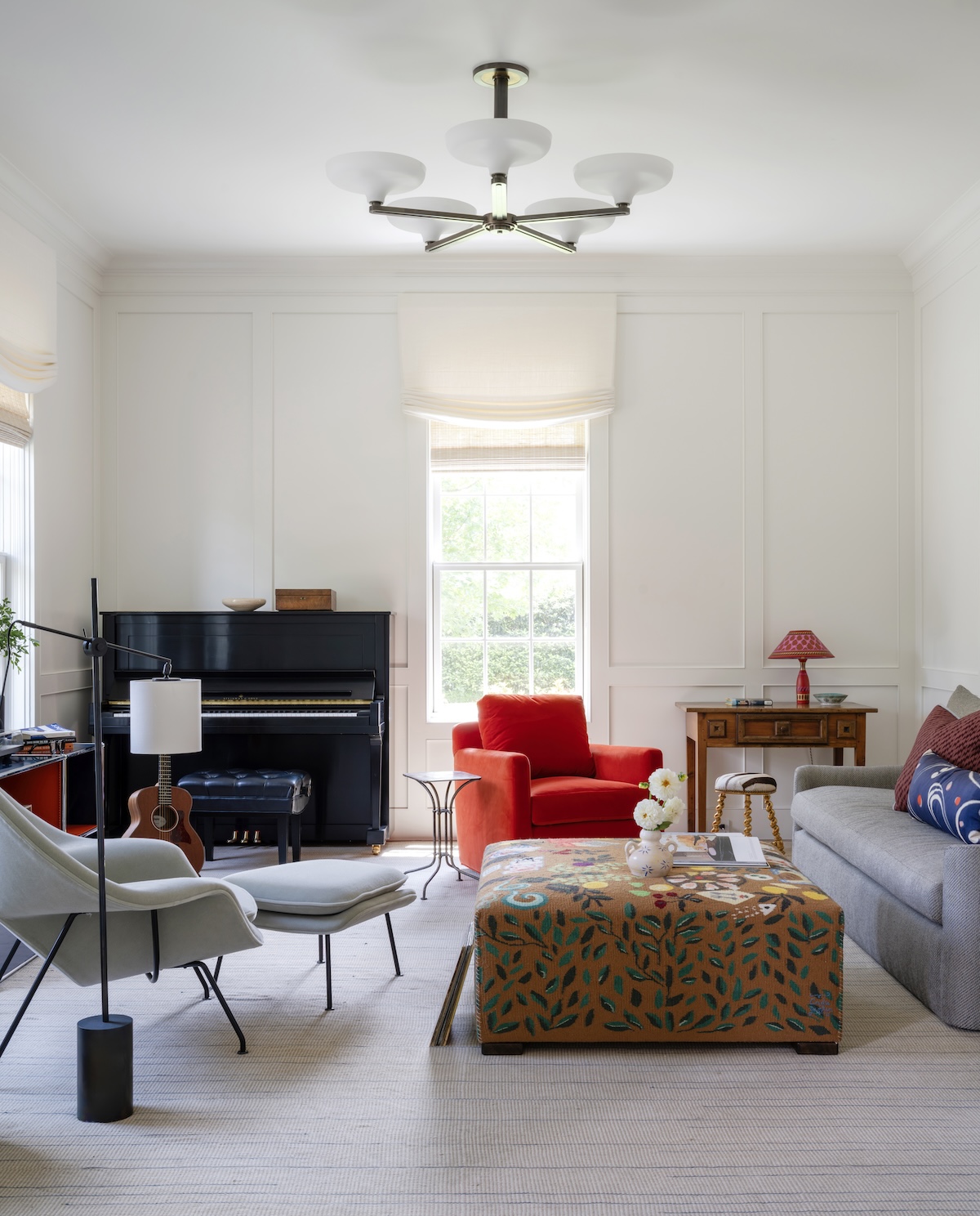We especially love the music room. Once a rarely used sitting room, it’s now the soul of the home. This vibrant lounge is where the couple begins each day—with coffee, conversation, and their favorite records playing. We relocated the family piano and sourced seating tailored to each of them: her poppy red chair, his Womb Chair. Above the sofa hangs a tambourine assemblage by artist Paul Lee—a surprise gift from husband to wife, revealed on install day.