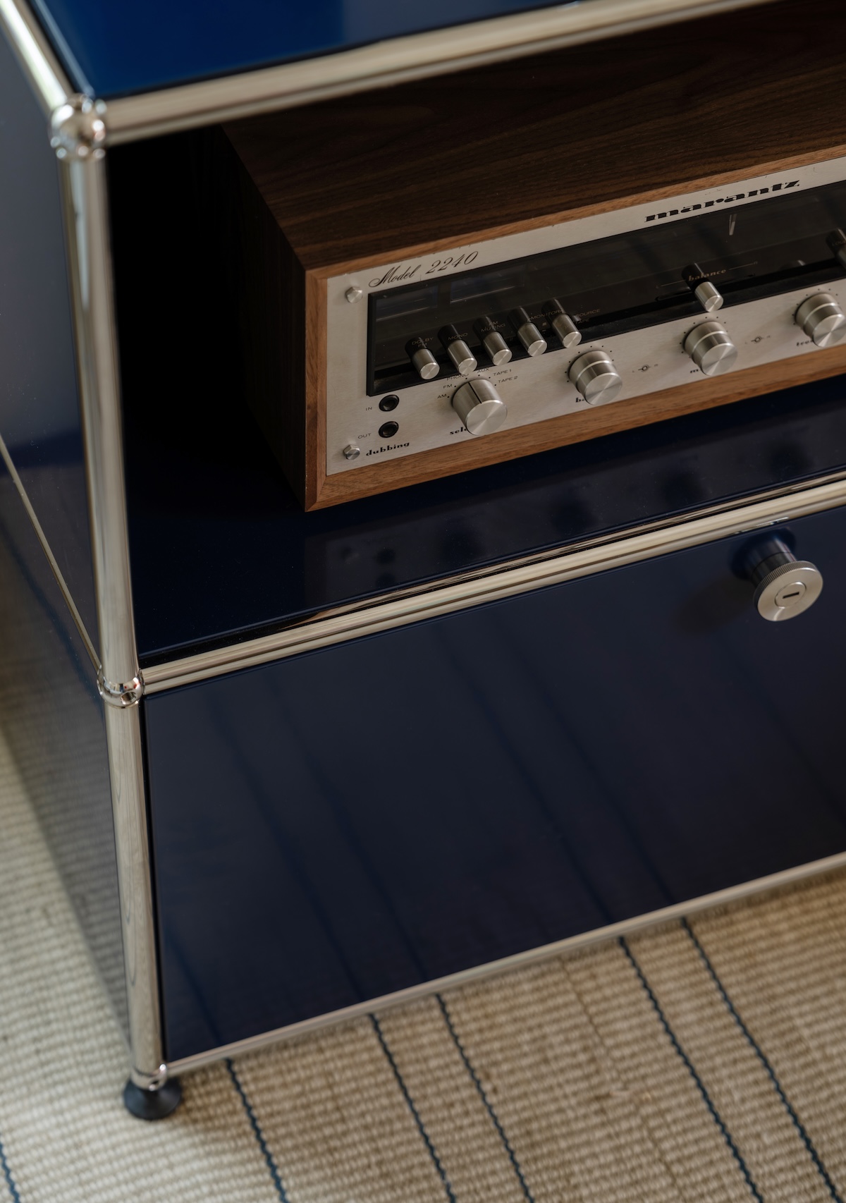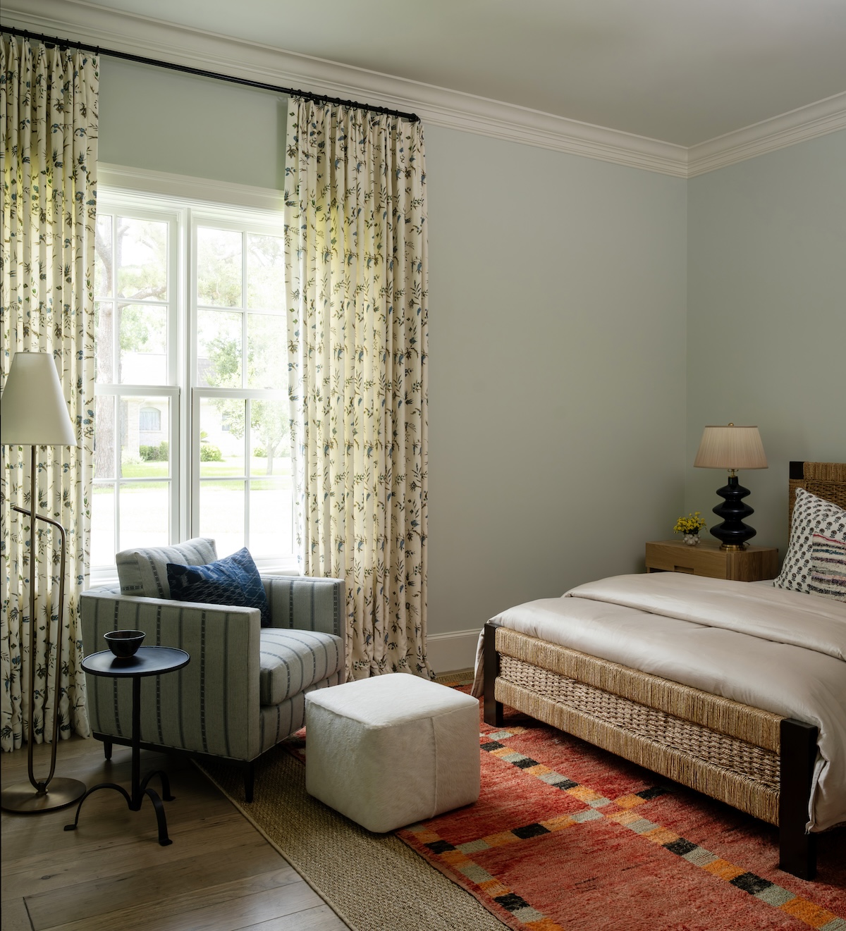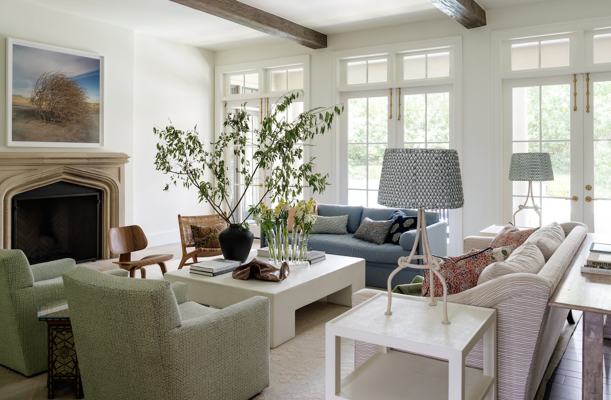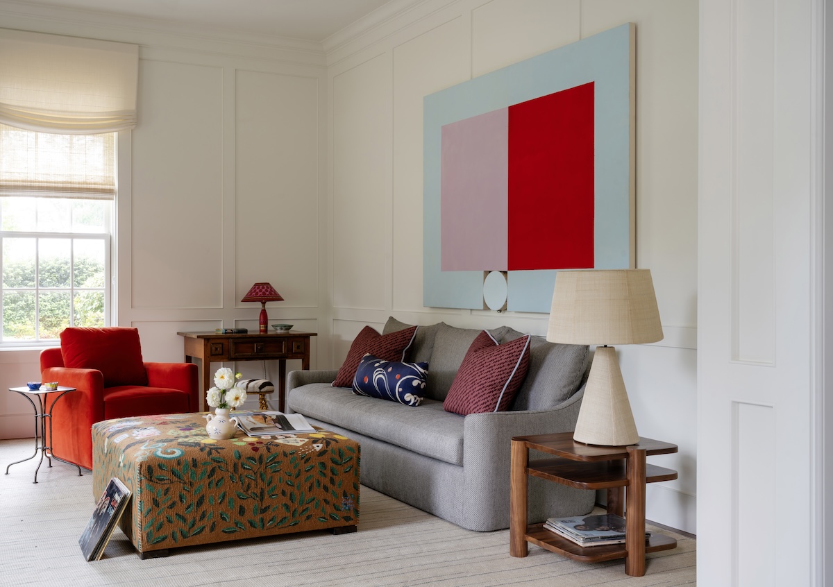 We especially love the music room. Once a rarely used sitting room, it’s now the soul of the home. This vibrant lounge is where the couple begins each day—with coffee, conversation, and their favorite records playing. We relocated the family piano and sourced seating tailored to each of them: her poppy red chair, his Womb Chair. Above the sofa hangs a tambourine assemblage by artist Paul Lee—a surprise gift from husband to wife, revealed on install day.