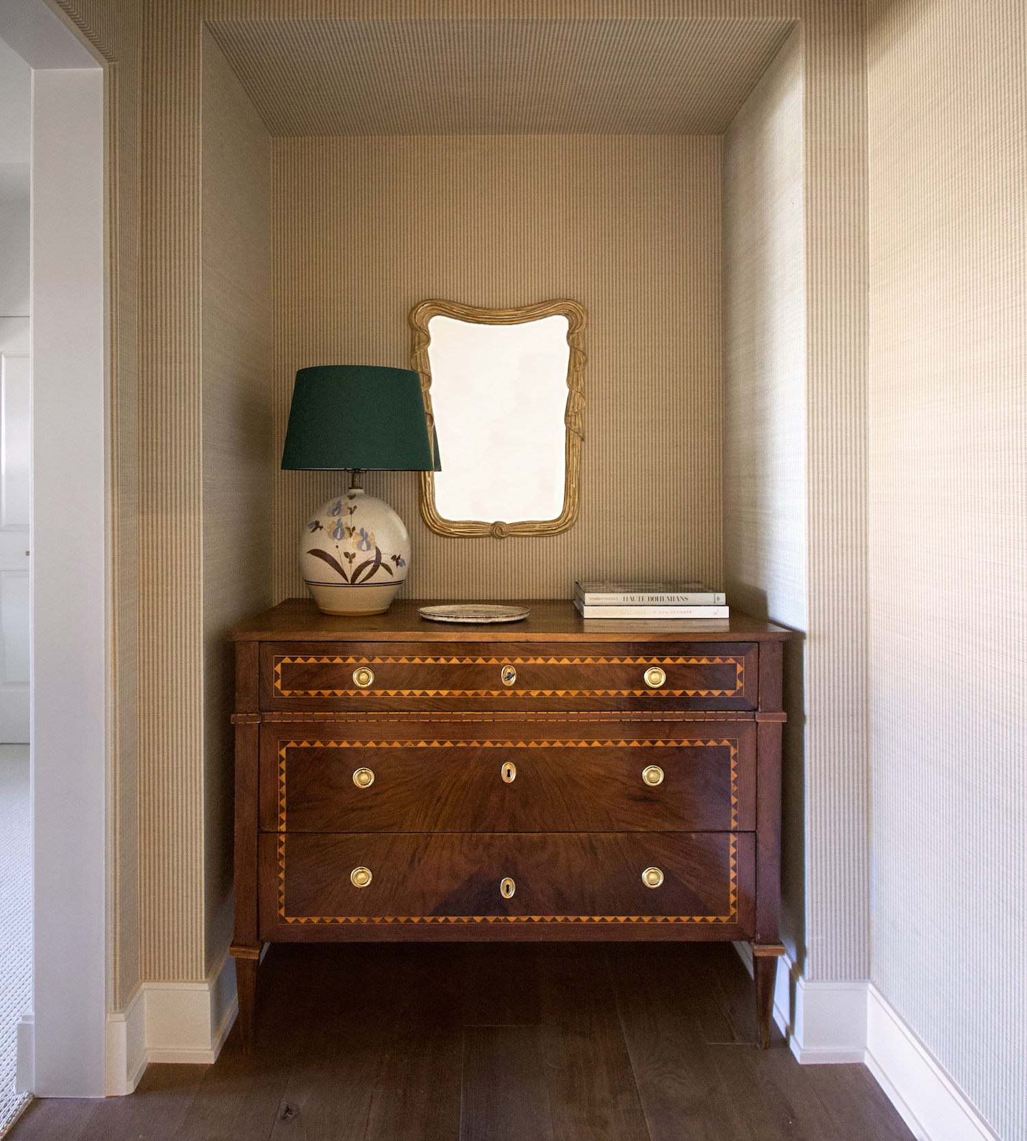Our palette merged the classic with the captivating. Elegant furnishings and finishes wove the narrative, like the painted wall paneling and a walnut table for the dining room. Unexpected elements included marble checkerboard flooring in the primary bath and hand-painted tiles for the kitchen, while brass hardware and fixtures infused elegance throughout.