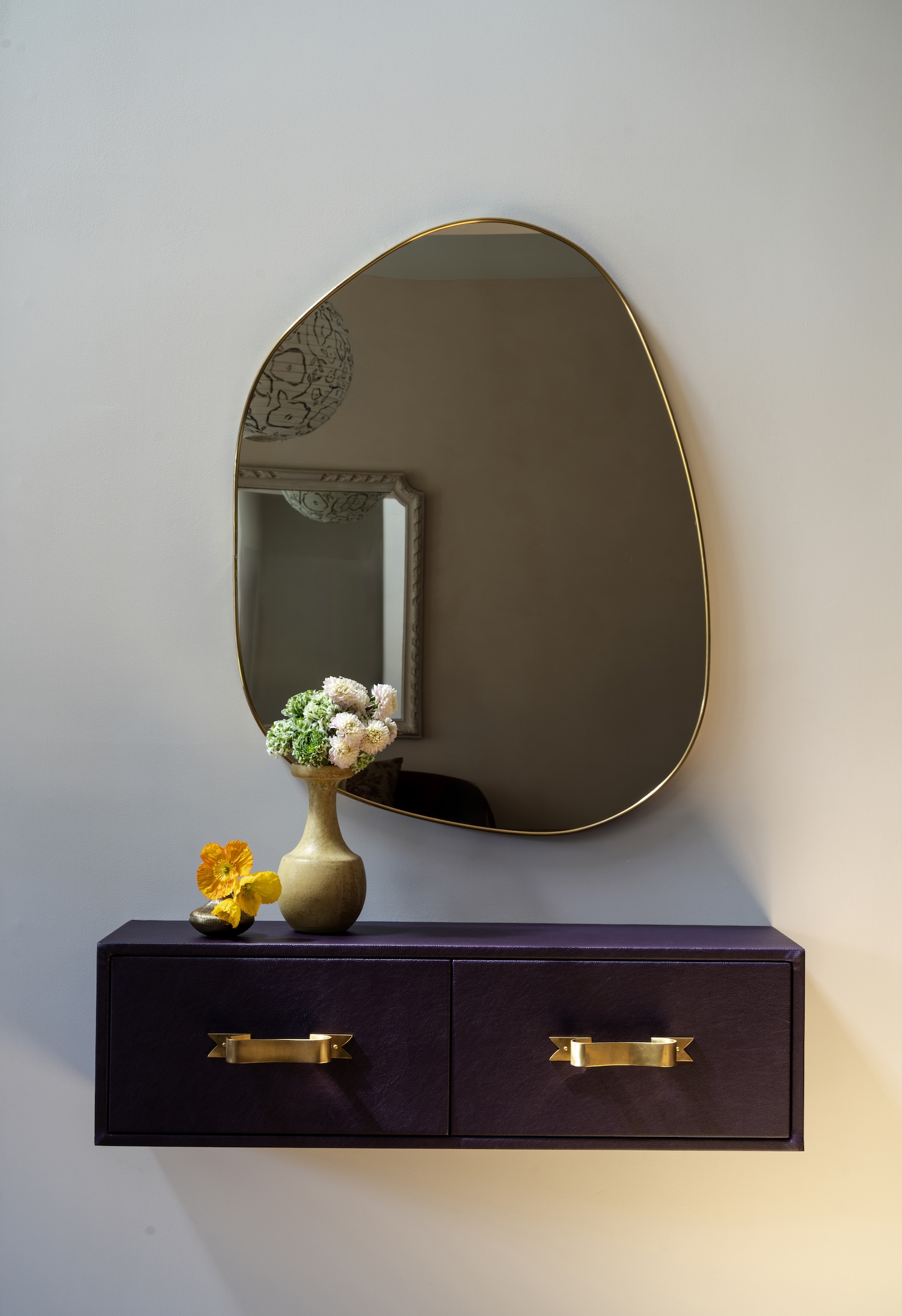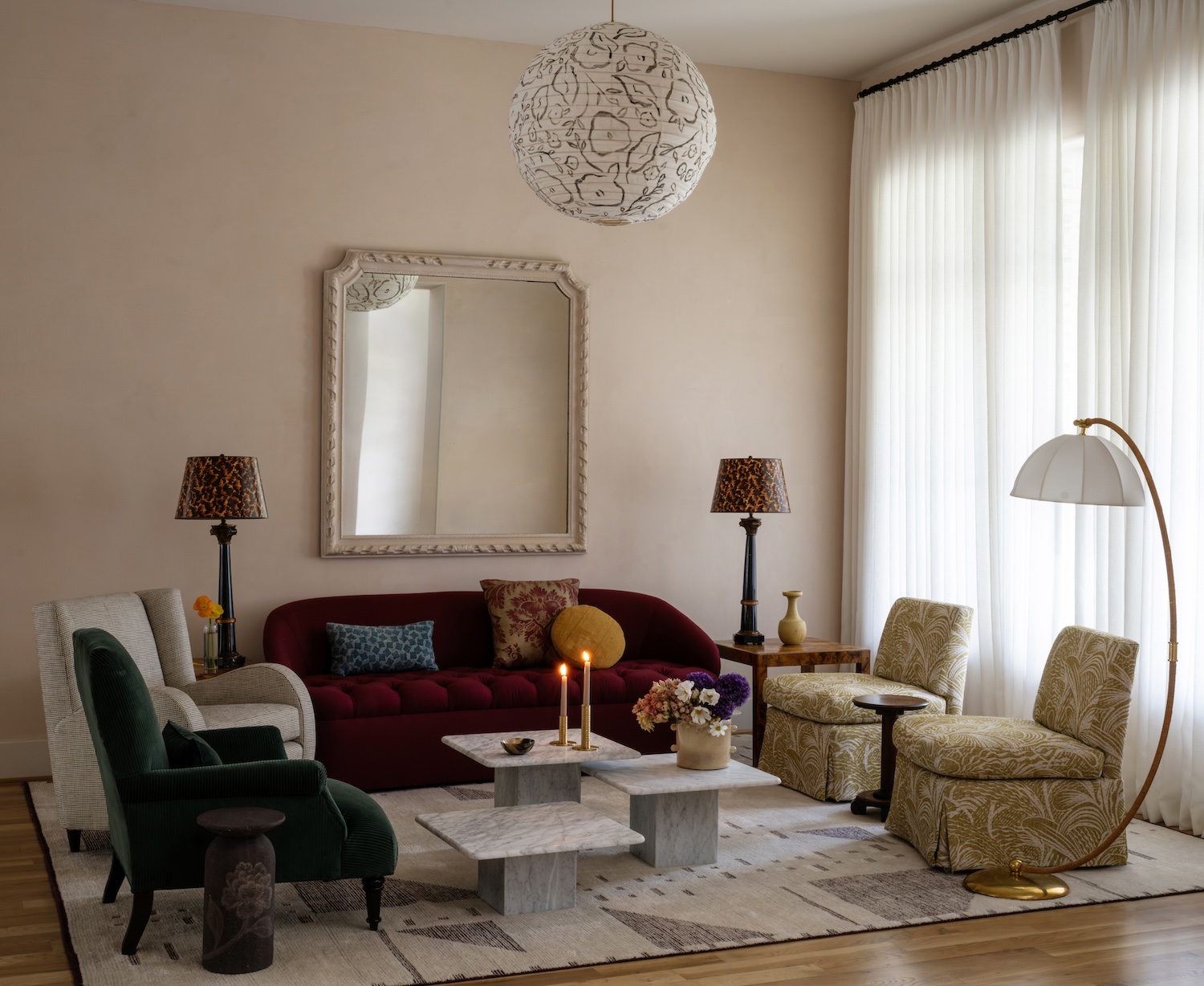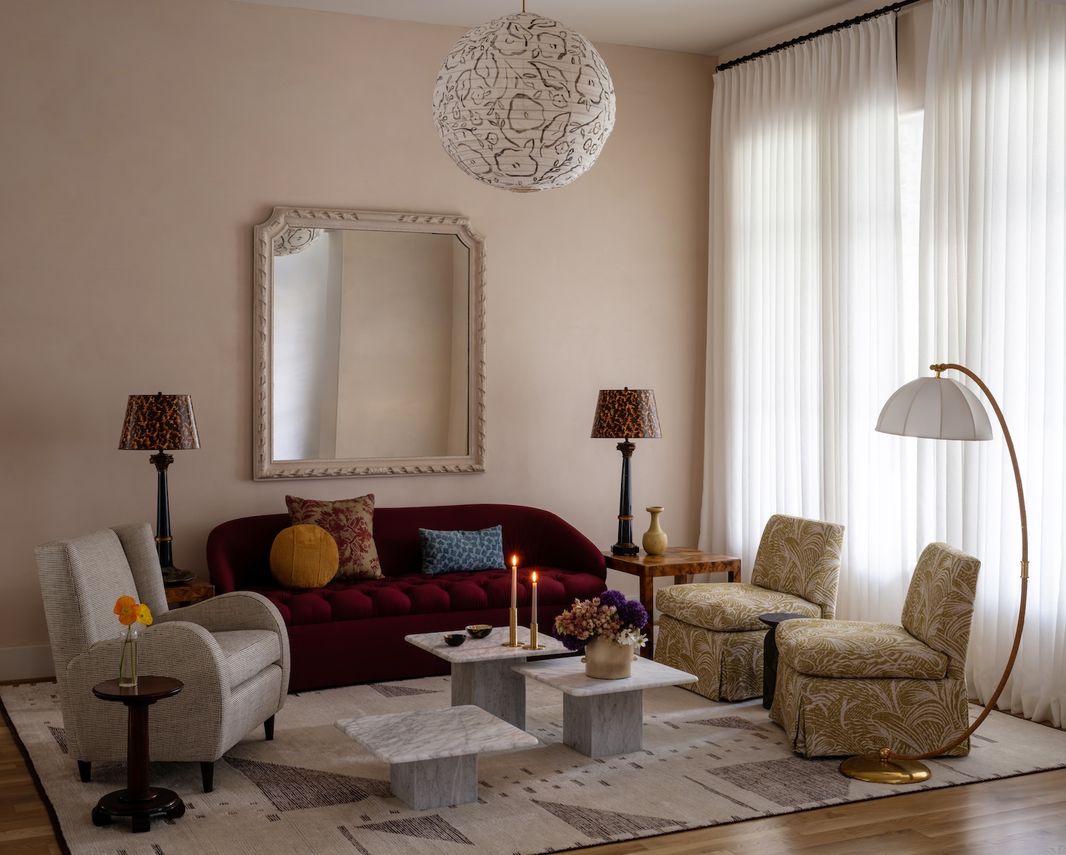 Our favorite room in the house—the formal sitting room—has a quiet kind of drama. A deep wool berry sofa anchors the space, layered with dark green channel velvet and a graphic wing chair that adds just the right tension. The oversized mirror above the sofa is painted the same color as the shell pink lime plaster walls, which shift with the light like candle glow at dusk. It was a genius move—allowing the scale of the piece to sing without shouting.