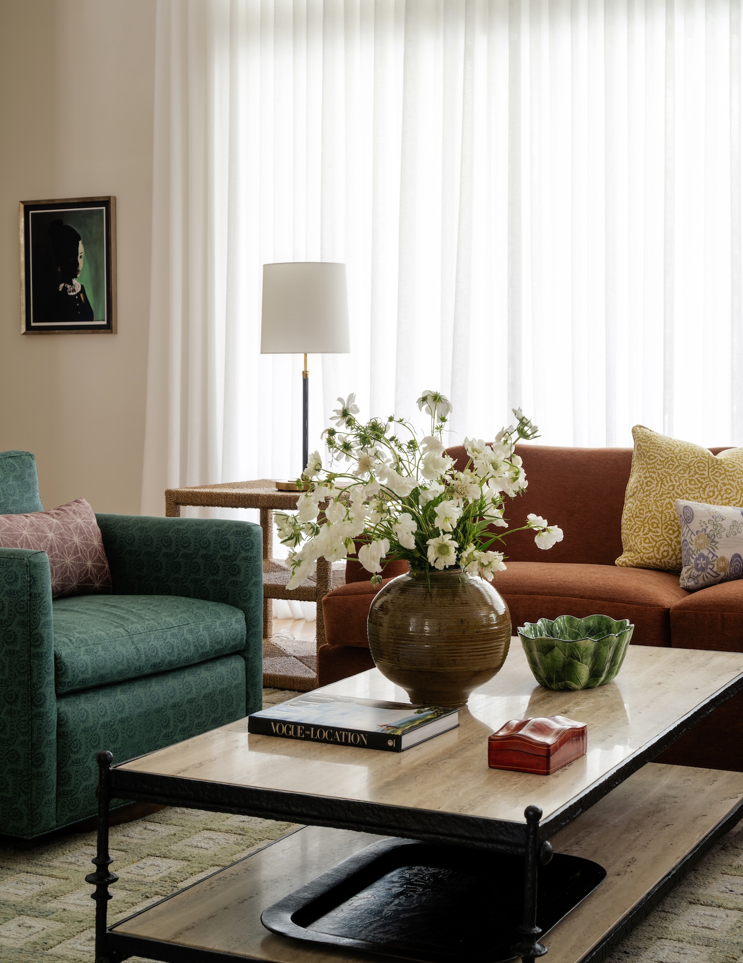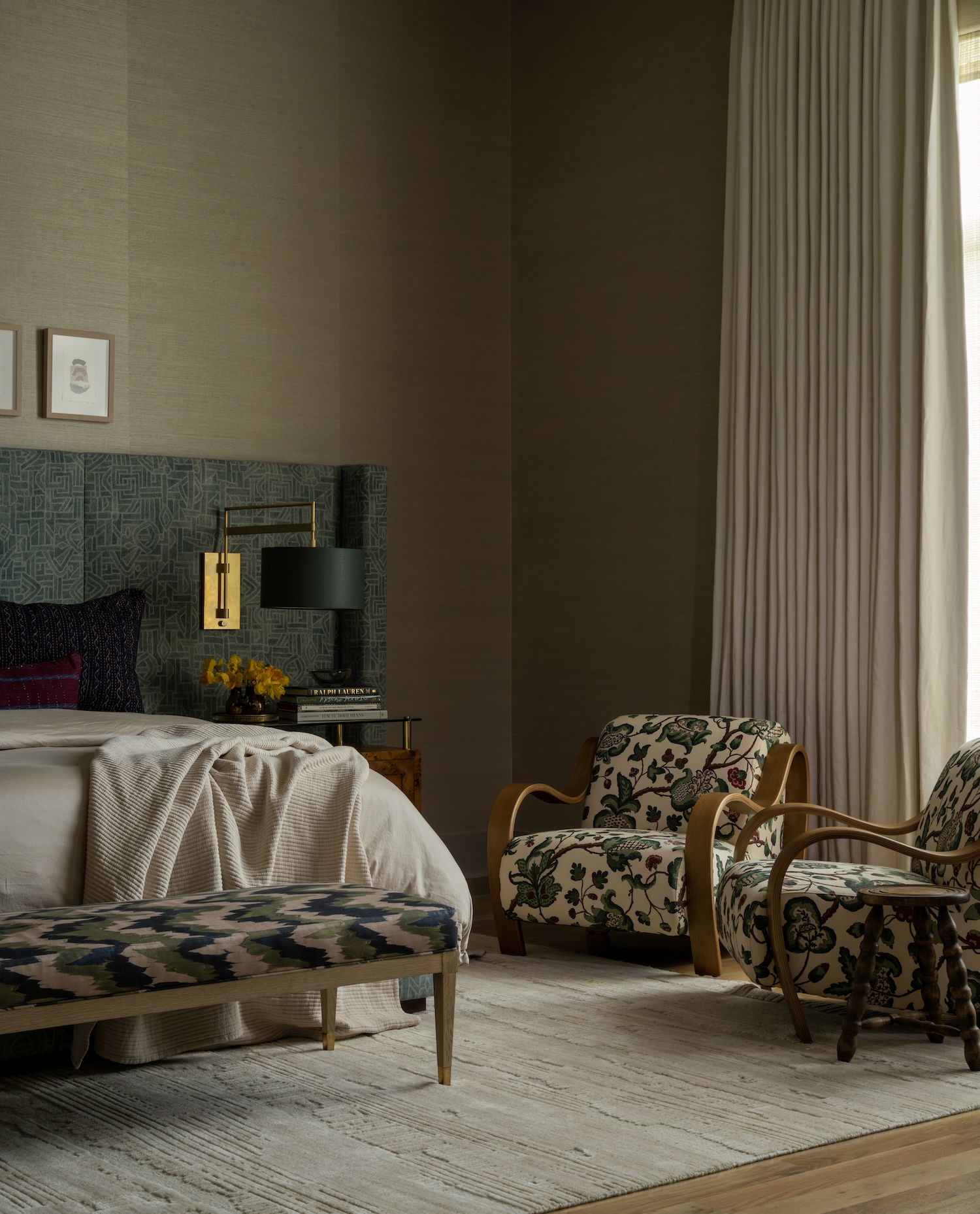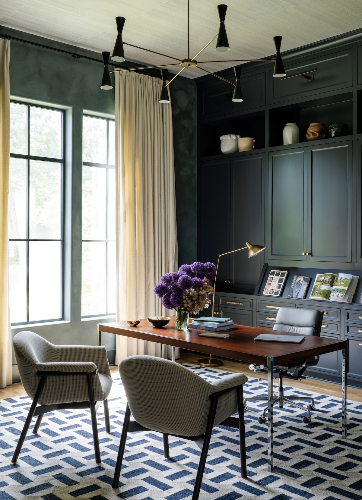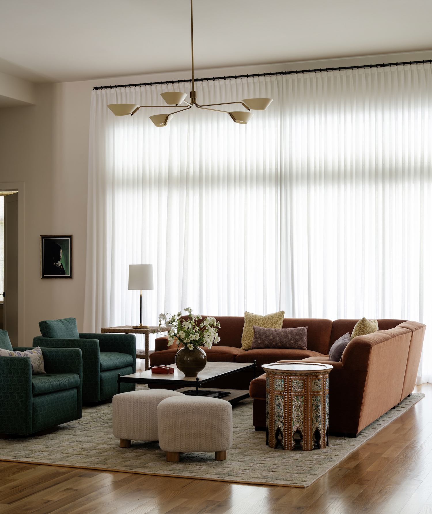 Throughout the home, we leaned into atmosphere and intention. In the dining room, that same plaster finish feels subtle and luminous alongside a large-scale photograph from Dale Goffigon’s Cuba series. The home office, once imposing, now feels tailored and calm—thanks to custom millwork, moody olive paint, and a grasscloth-clad ceiling. And in the family room, warm-toned fabrics and sheer drapes create a soft, filtered light that shifts throughout the day. Every room was designed to reflect the clients’ rhythm, their rituals and the beauty of everyday living.