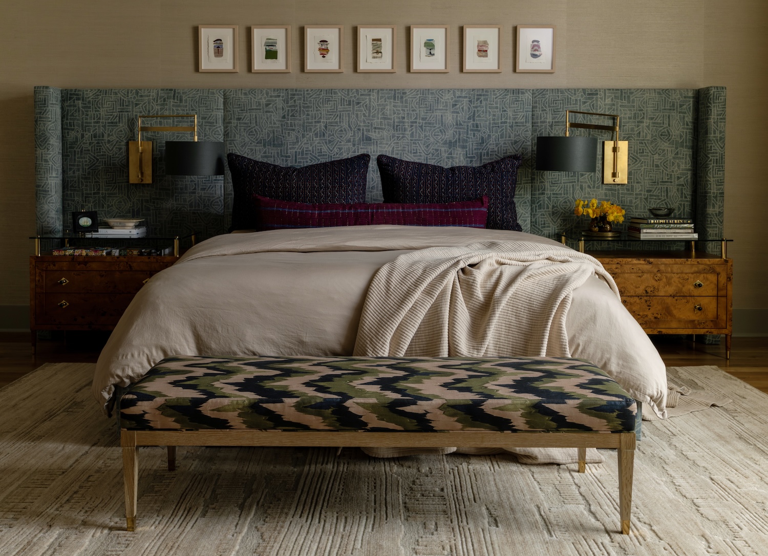 In the primary suite, we designed a custom bed—an exercise in both proportion and function. The oversized headboard anchors the room, and the bed was built to accommodate the clients’ Eight Sleep mattress, complete with a water reservoir and complex electrical components. Our client loves to read in bed, so lighting was key. Built-in sconces and hidden outlets in the custom nightstands make the space both beautiful and practical.